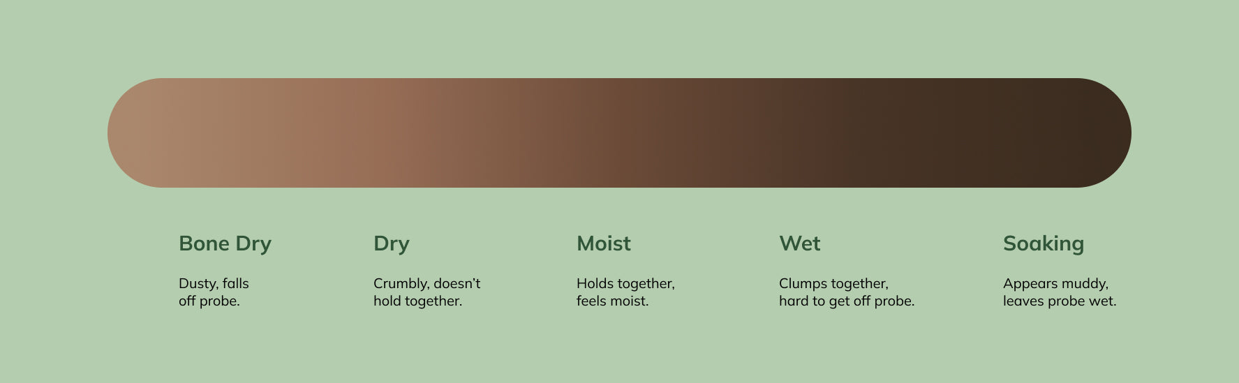 - Unless the soil sample is obvious that it is either wet or dry, feeling the sample between two fingers is always the best practice, as going off colour alone can be deceivingIn larger pots, probe several times in different areas to confirm the soil moisture